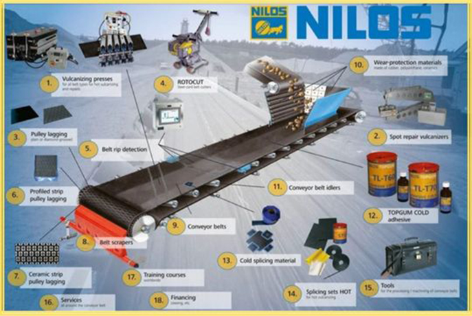 Nilos is known for the application-oriented development of high quality-innovative products of conveyor belt equipment. Nilos comprises hot vulcanizing and cold repair material as well as conveyor belt equipment ranging from simple small tools to vulcanizing presses. Nilos products will continue to ensure smooth and economic working process in many companies around the world.