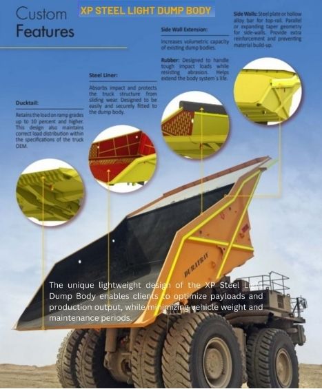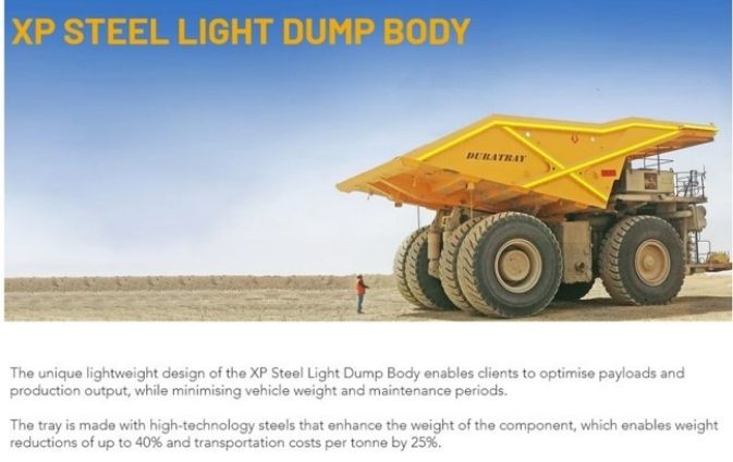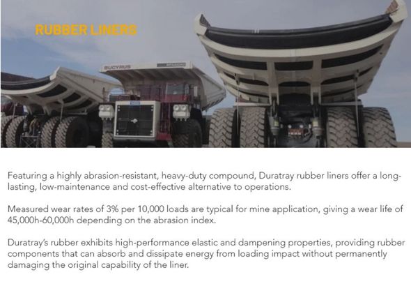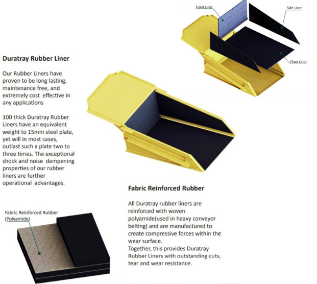 Duratray’s staple product, the Suspended Dump Body (SDB), offers a unique lightweight tray that consists of a flexible rubber wear mat supported by high capacity synthetic suspension ropes and a steel frame resistant to abrasion.This design has demonstrated a wide range of benefits catered to specific mine and quarry applications, including increasing payload, combating carryback and reducing noise.